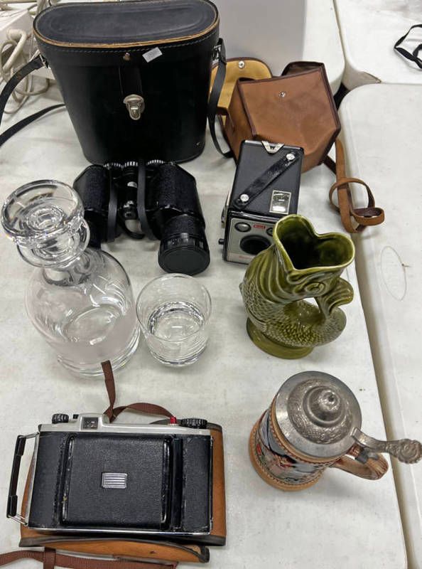 Binoculars with case, stuart decanter with thistle decoration, kodak brownie camera etc