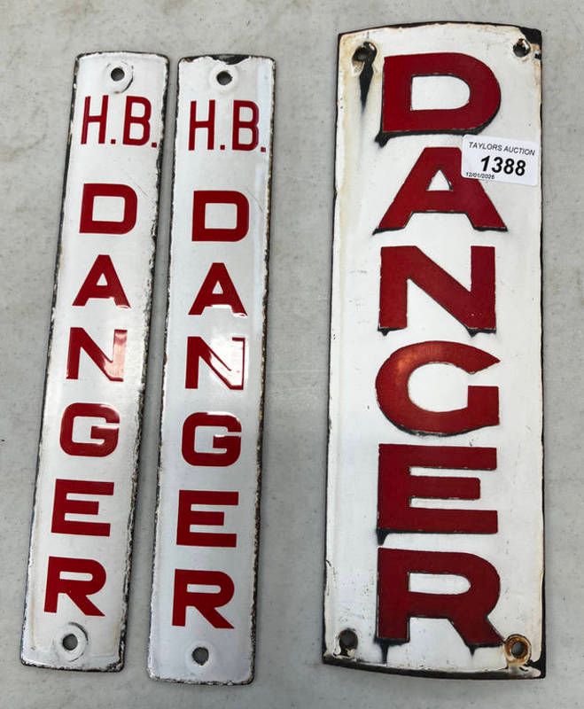3 enamelled metal danger signs / plaques