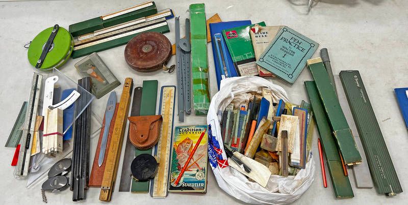 Ww2 period leather cased pocket compass stamped usce 1942 along with rulers, drafting equipment etc