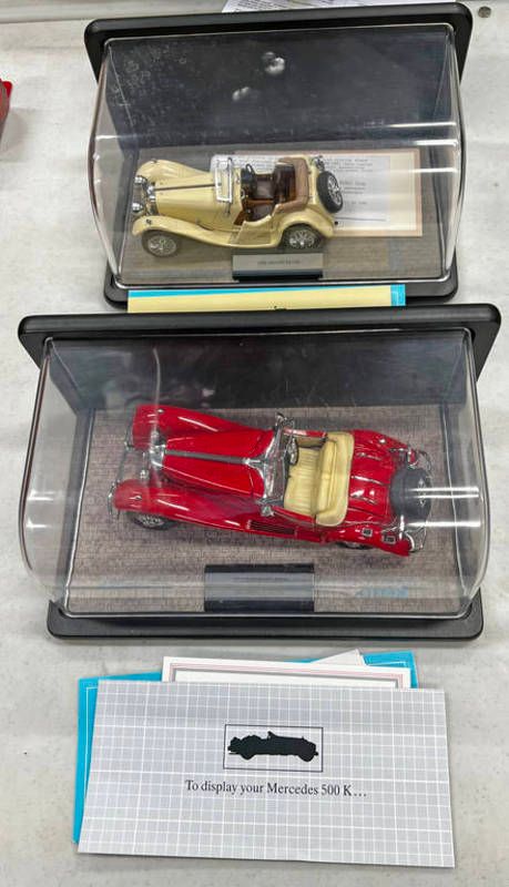 Two franklin mint model cars, 1935 mercedes benz 500k special roadster and a 1938 jaguar ss-100, both cased with documents