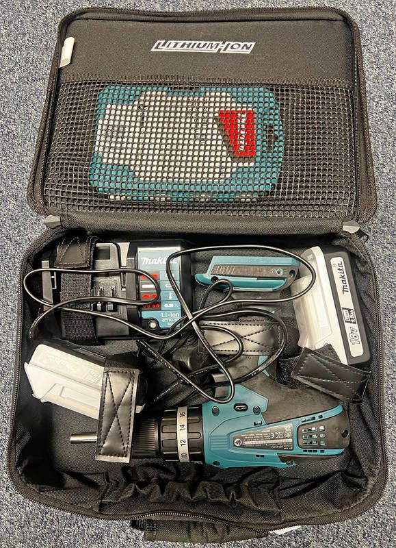 Makita battery drill, hp 457d in carry case with charger, batterys and accessories, on view in office