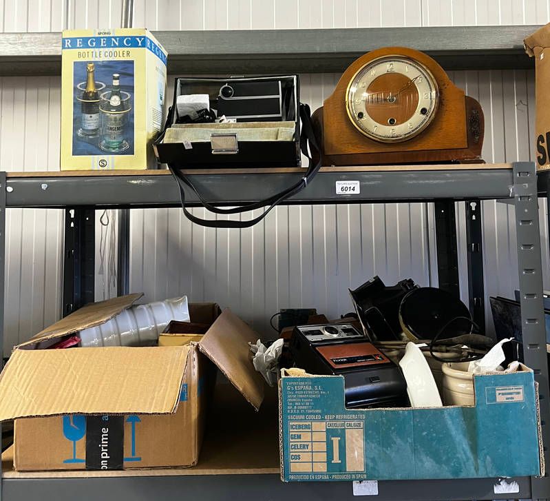 Mantle clock, crockery, kodak camera, table lamp, paraffin lamps etc.