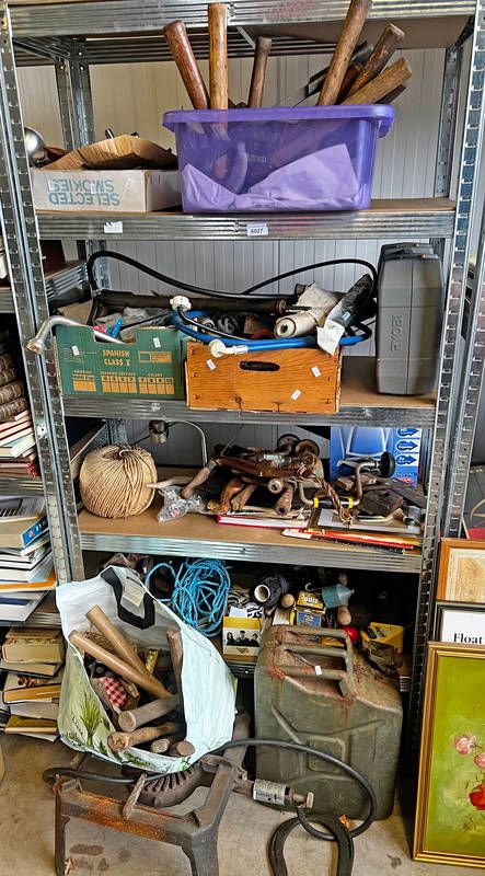 Vintage tools to include hammers, escape axe, braces, jerry can etc over one shelving unit