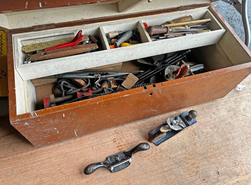 Joiners wooden tool box with contents of various tools to include stanley no 80 cabinet scraper, record no 4 1/2 plane, small vice etc