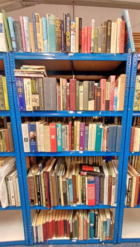The siege at peking by peter fleming - 1971, goethe's hermann und dorothea - 1883, first on the moon: a voyage with neil armstrong, michael collins & edwin e. aldrin jr., by gene farmer and dora jane hamblin - 1970, and various other books over 5 shelves