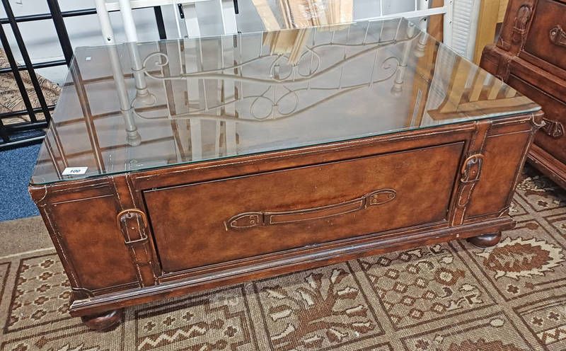 Rectangular coffee table with glass top & single drawer on bun feet modelled after a suitcase - 102 cm long