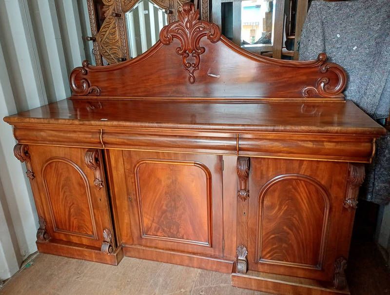 19th century mahogany sideboard with decorative shaped back & 3 drawers over 3 panel doors on plinth base - 208 cm