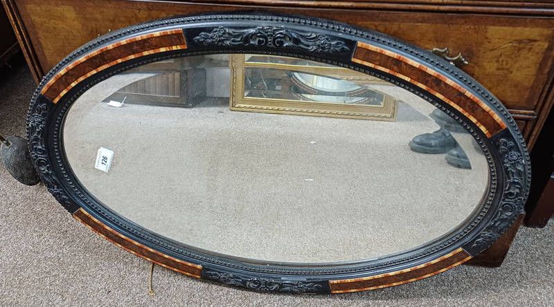 Oval mirror with bevelled edge & ebonised frame with decorative burr insets