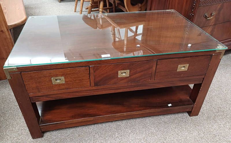 Late 20th century mahogany rectangular coffee table with 3 drawers & brass fittings - 101 cm long