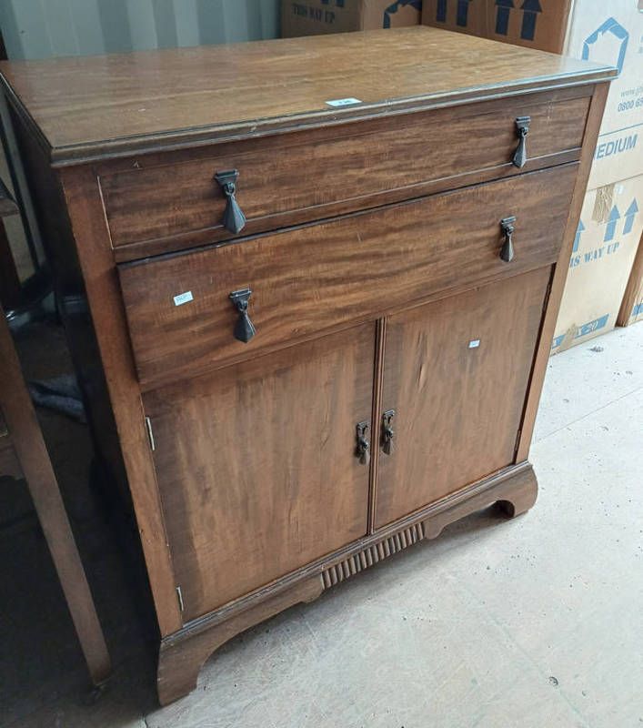 20th century mahogany cabinet with lift lid top opening to sectioned interior with mirrored back over 2 long drawers with 2 panel doors below - 76 cm wide