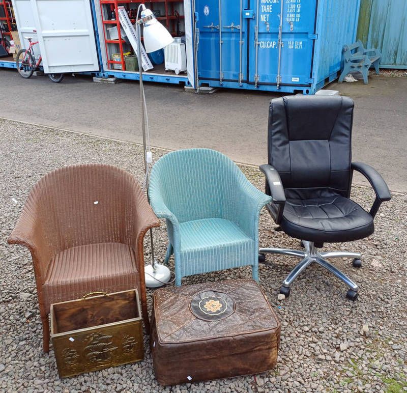 2 lloyd loom chairs, embossed brass magazine rack, office chair etc