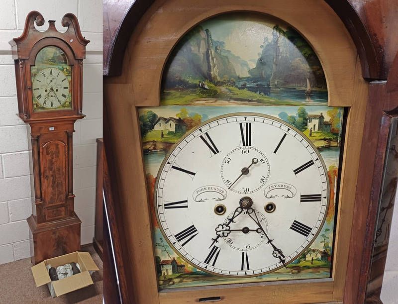 19th century mahogany grandfather clock with painted dial with river & rural scene decoration signed, john hunter inverurie - 209 cm tall