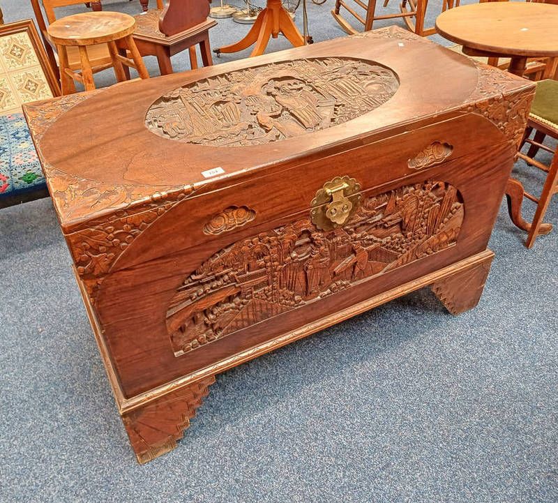 Eastern camphor wood trunk with overall carved oriental scene decoration on bracket supports - 71 cm tall x 104 cm wide