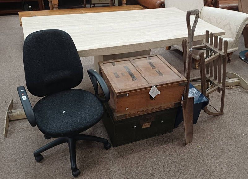 2 lloyd loom chairs, embossed brass magazine rack, office chair etc