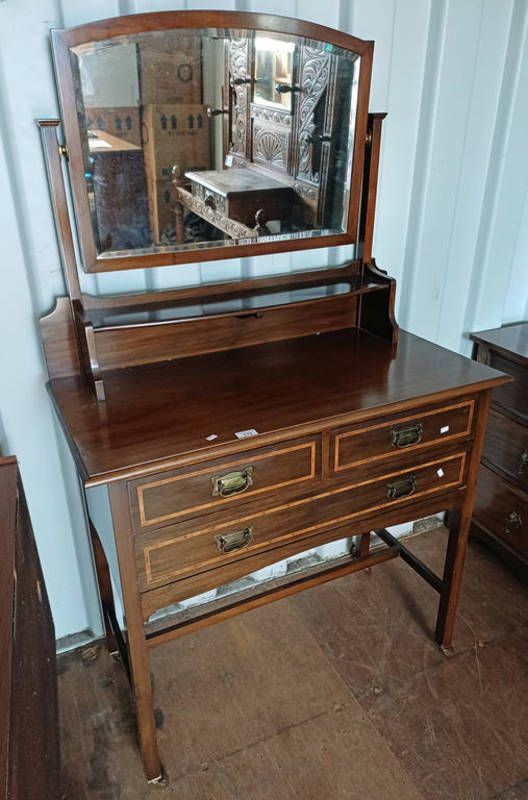 Early 20th century inlaid mahogany dressing table with mirror over 2 short over single long drawer, 91cm wide
