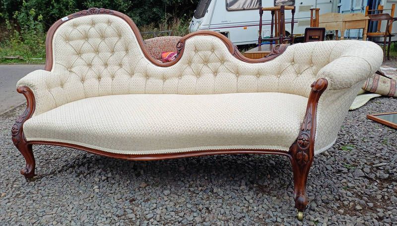 19th century carved mahogany framed buttoned back chaise longue on cabriole supports