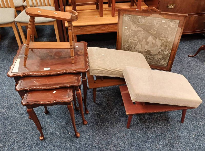 Tapestry topped stool with lift lid seat, nest of 3 tables, tapestry screen etc.