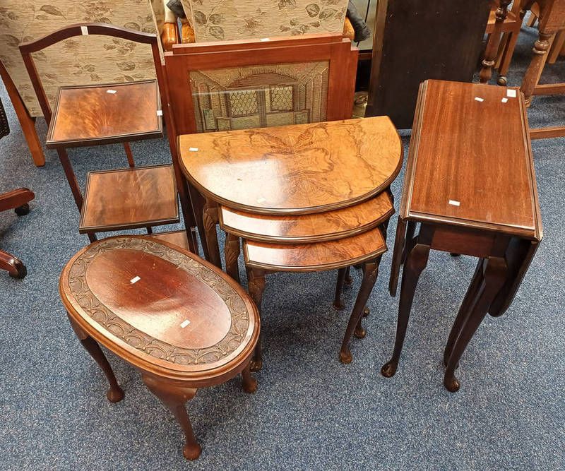 Nest of 3 walnut demi lune tables, walnut 3 tier folding cake stand etc.