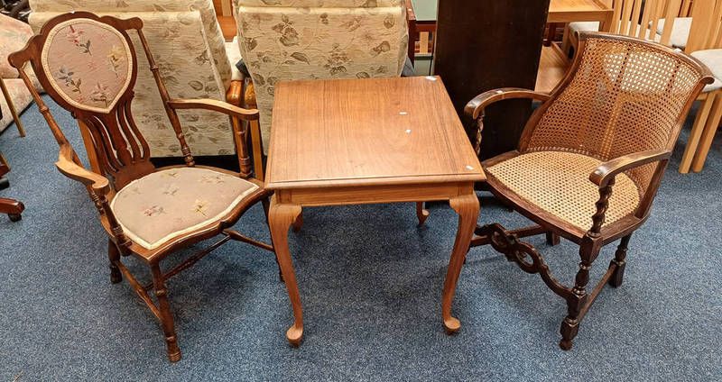 Beech chair with bergere panel back & seat on barley twist supports, hardwood square table, and one other armchair