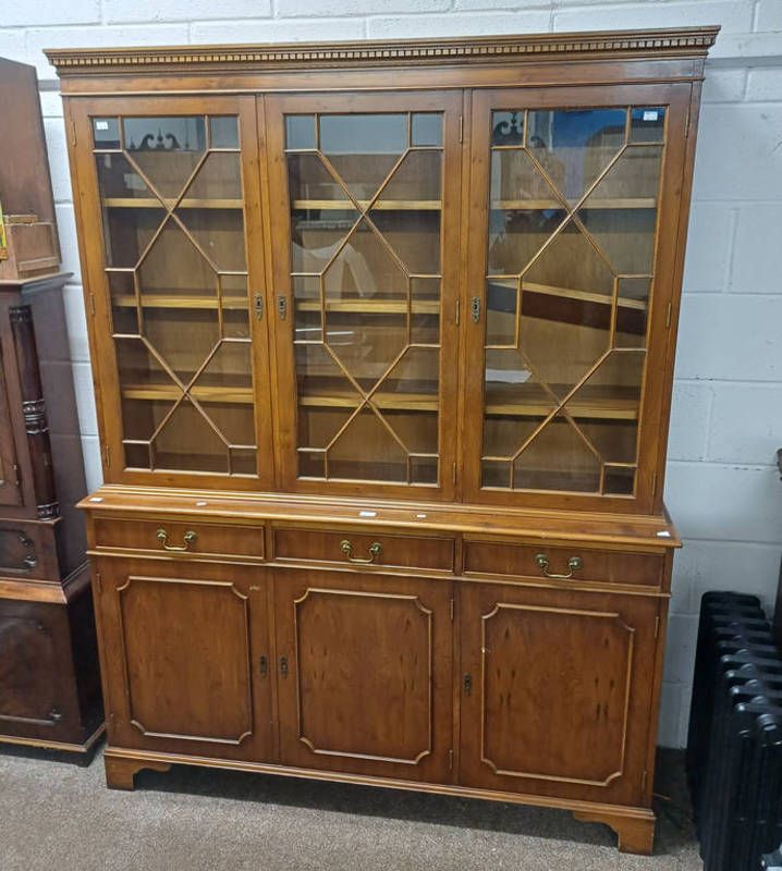 Yew wood bookcase with 3 astragal glass panel doors over 3 drawers over 3 panel doors on bracket supports - 193 cm tall
