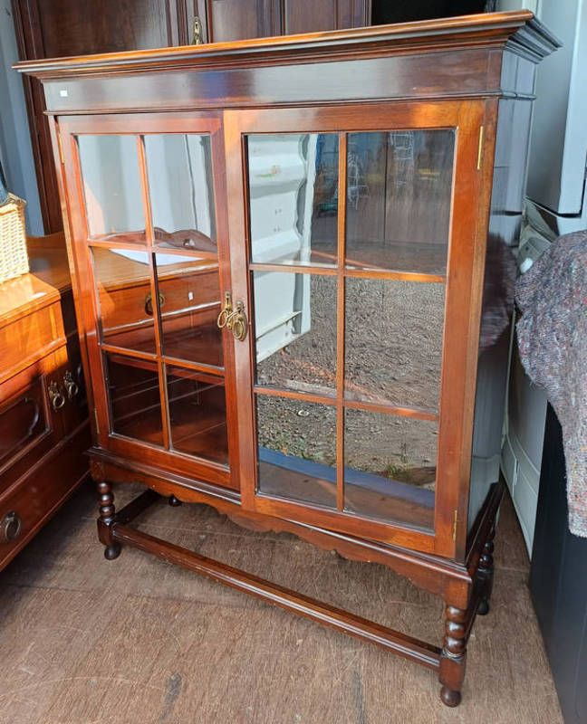 Early 20th century mahogany bookcase with 2 glazed panel doors on bobbin supports - 129 cm tall x 105 cm wide