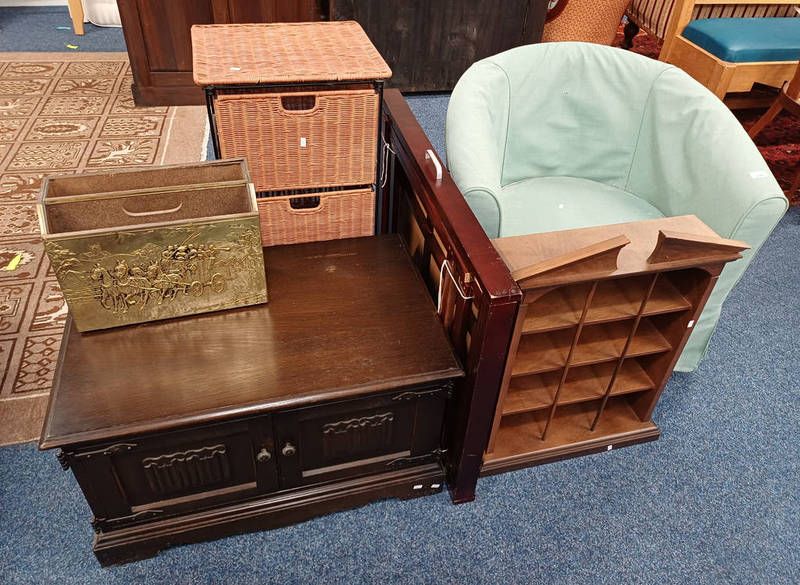 Pair of brown leatherette tub chairs with stools, pine bed, bookcase, etc