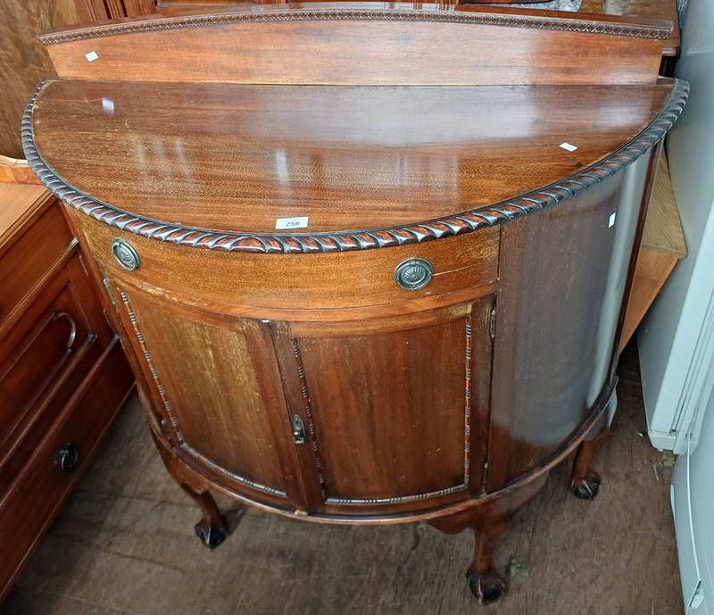20th century mahogany demi-lune cabinet with single drawer over 2 panel doors on ball & claw supports - 104 cm wide