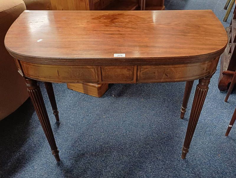 Regency inlaid mahogany tea table on reeded tapered supports - 74cm tall x 91 cm wide x 45cm deep
