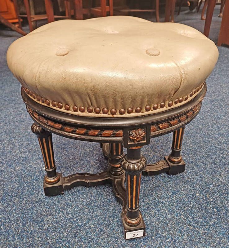 19th century ebony & gilt circular stool with buttoned leather top on reeded supports stamped 'holland & sons' to underside
