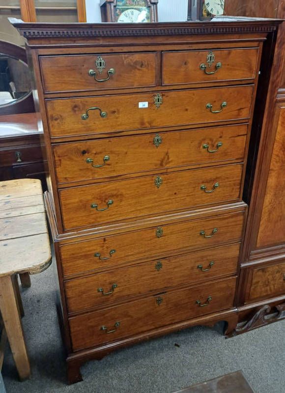 19th century mahogany chest on chest with 2 short over 3 long drawers on base of 3 long drawers on bracket supports