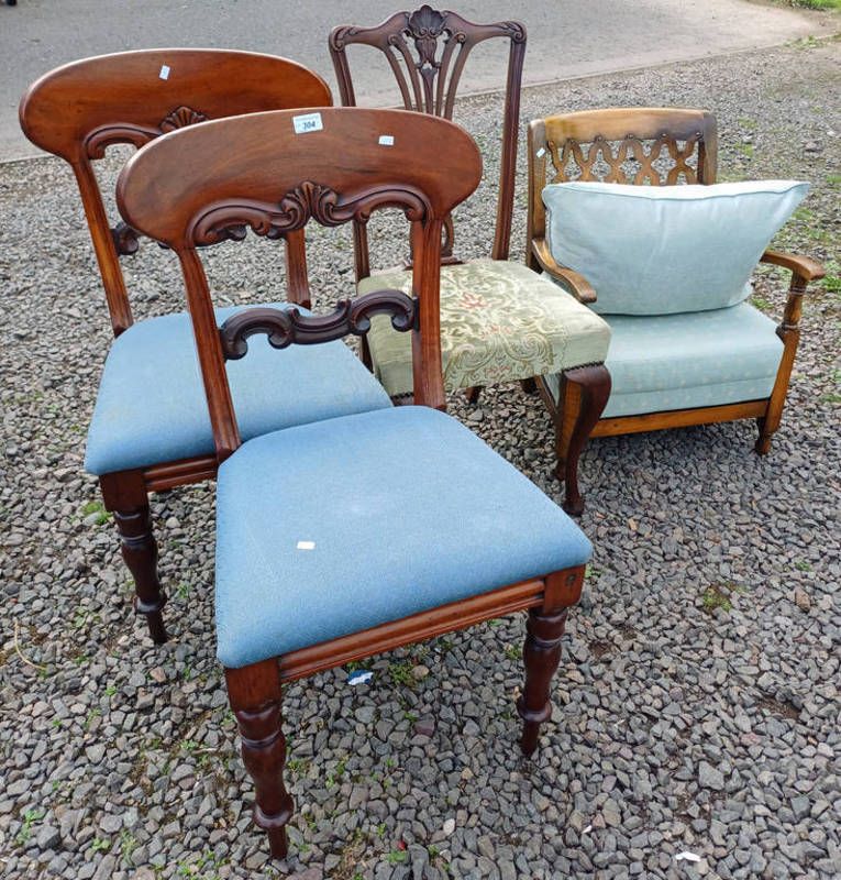 Pair of 19th century mahogany dining chairs, beech open armchair with fretwork panel back, etc
