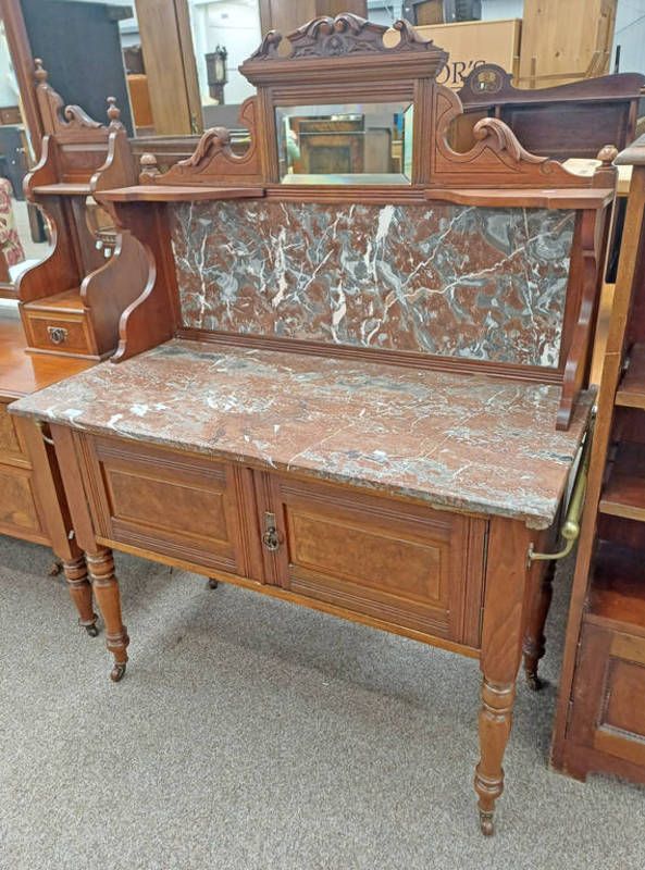 Late 19th century mahogany marble topped washstand with marble inset mirror back, 2 panel doors and brass fittings on turned supports - 142 cm tall x 106 cm wide