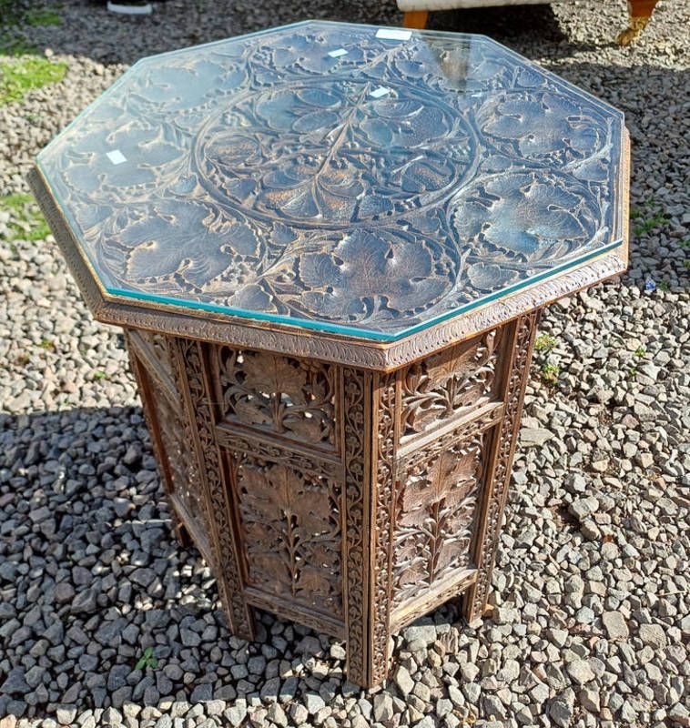 Eastern hardwood octagonal table with overall carved foliage & leaf decoration - 53 cm wide