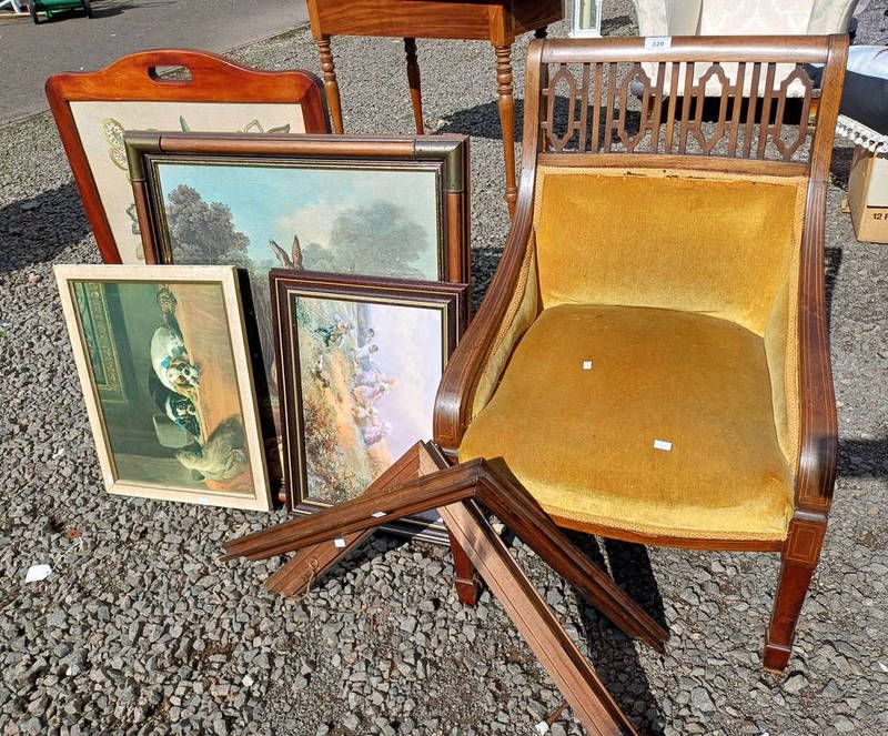 Late 19th century inlaid mahogany ladies chair on square tapered supports, mahogany tapestry fire screen & 3 framed prints