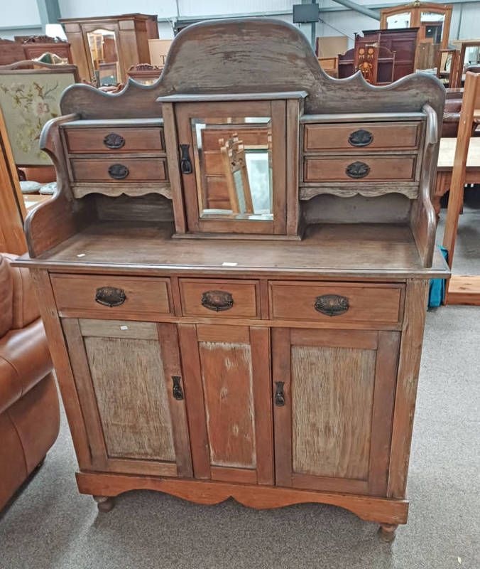Pine dresser with 3/4 gallery with centrally set mirror door flanked to each side by 2 short drawers with 3 drawers over 2 panel doors below - 122 cm wide
