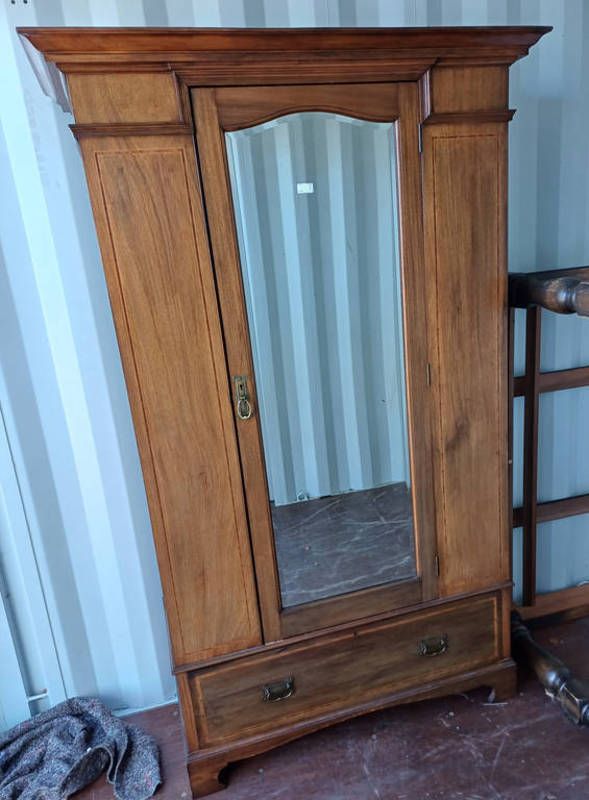 Early 20th century mahogany mirror door wardrobe with decorative boxwood inlay & single drawer to base - 198 cm tall