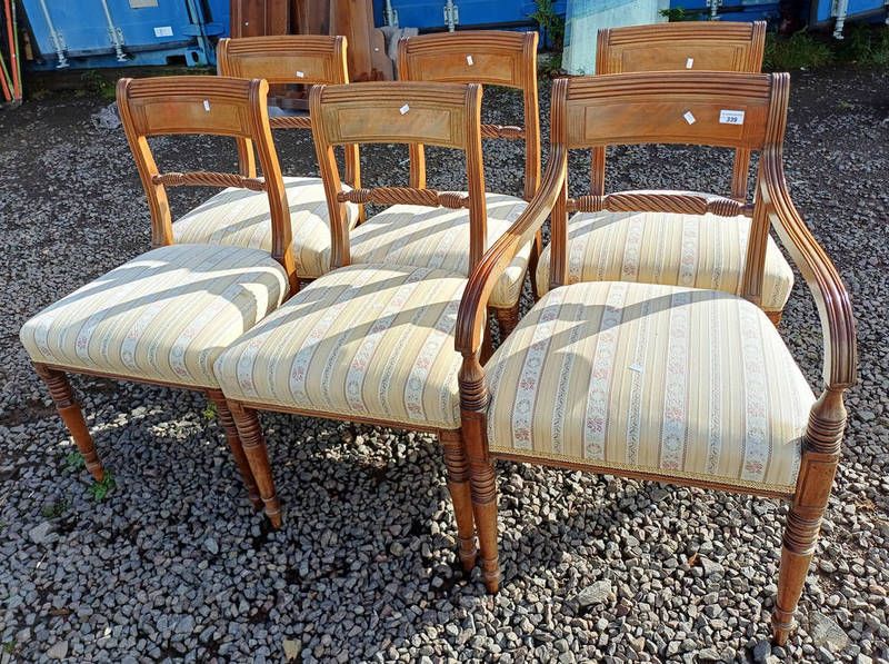 Set of 6 early 20th century mahogany dining chairs with brass line inlay on turned supports including 2 armchairs