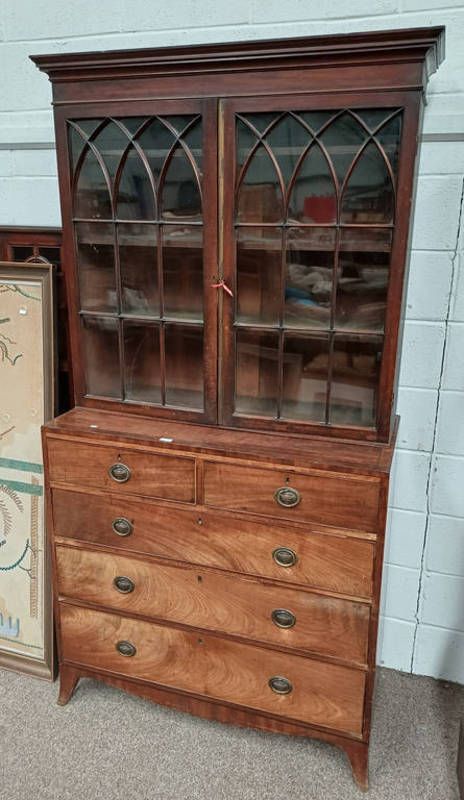 19th century mahogany bookcase on chest with 2 astragal glass panel doors over base with 2 short over 3 long drawers on splayed supports - 211 cm tall x 107 cm wide