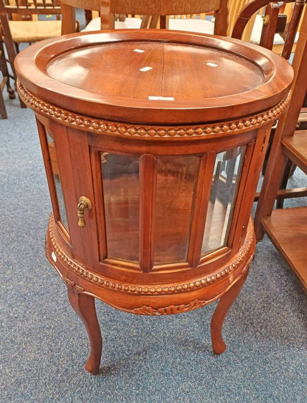 Hardwood cylinder drinks cabinet with bevelled glass panel sides & single door on shaped supports - 78 cm tall