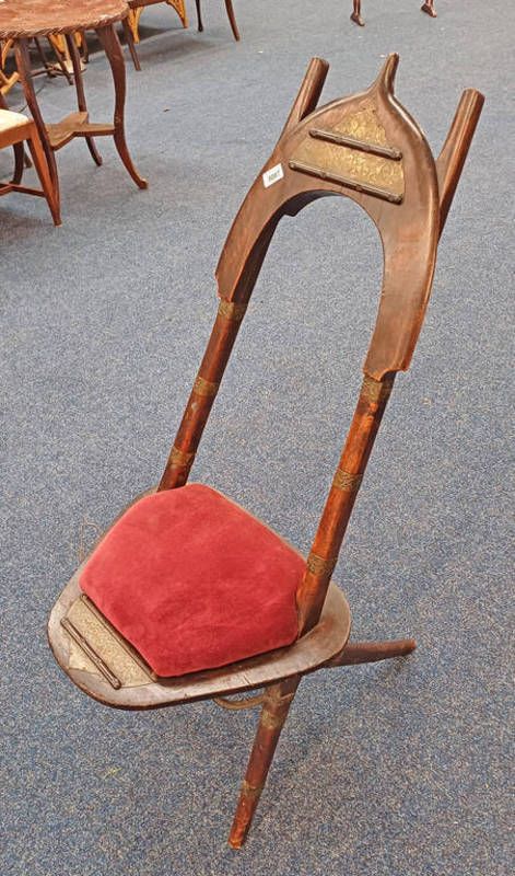 Oriental hardwood chair with ornate copper & etched brass fittings - 110 cm tall