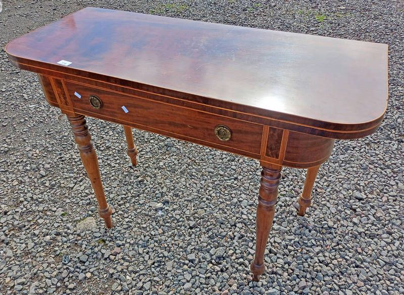 Late 19th century inlaid mahogany tea table with single drawer on turned supports - 107 cm wide
