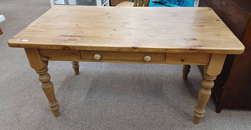 Pine kitchen table with single drawer to side on turned supports - 152 cm long