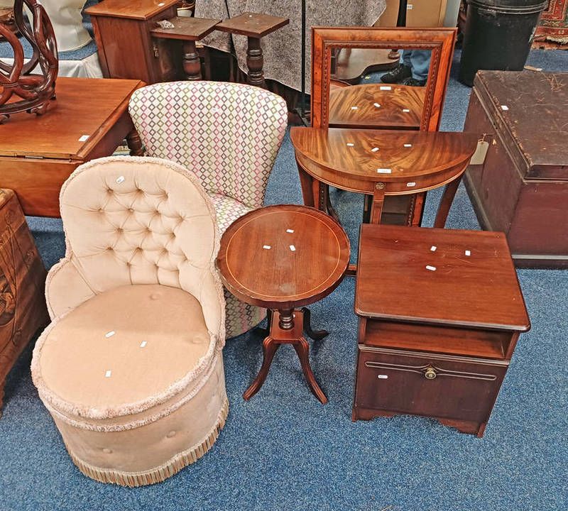 2 bedroom chairs, mahogany demi-lune table, etc.
