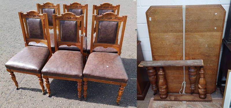 Late 19th century oak extending dining table with extra leaf & set of 6 oak dining chairs with carved decoration on turned supports