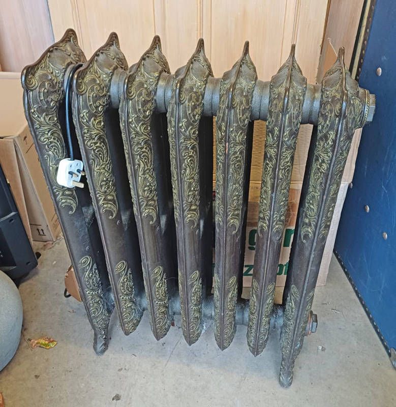 Cast metal fire back with embossed roman scene, pair of leaded stained glass panels, etc