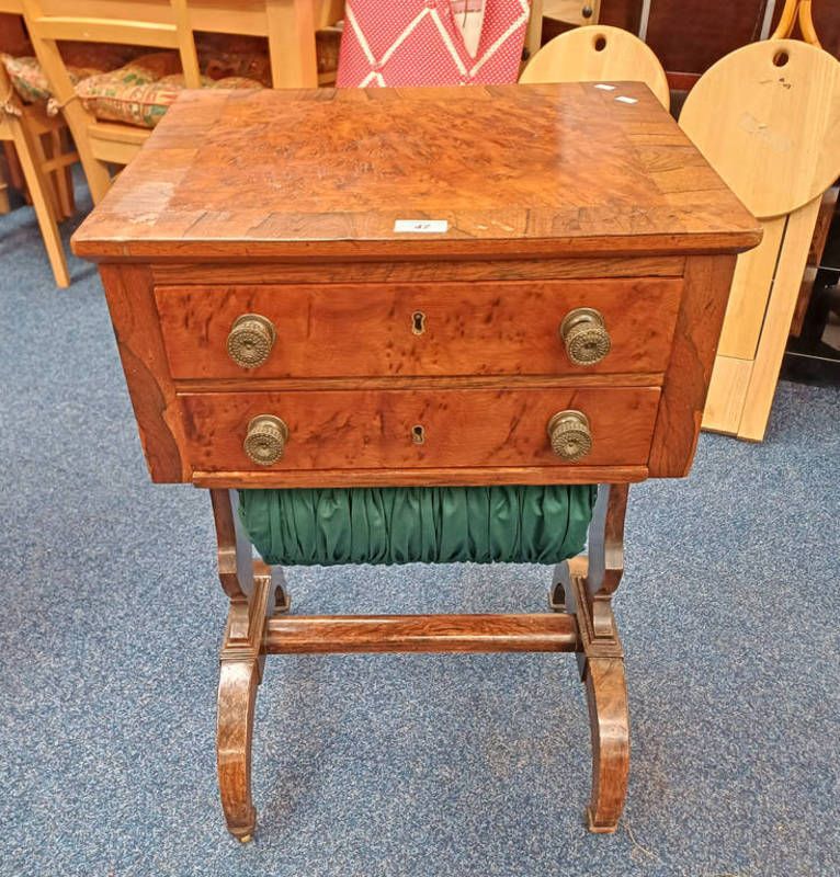 19th century burr walnut & rosewood crossbanded sewing table with 2 drawers & shaped ends - 77 cm tall