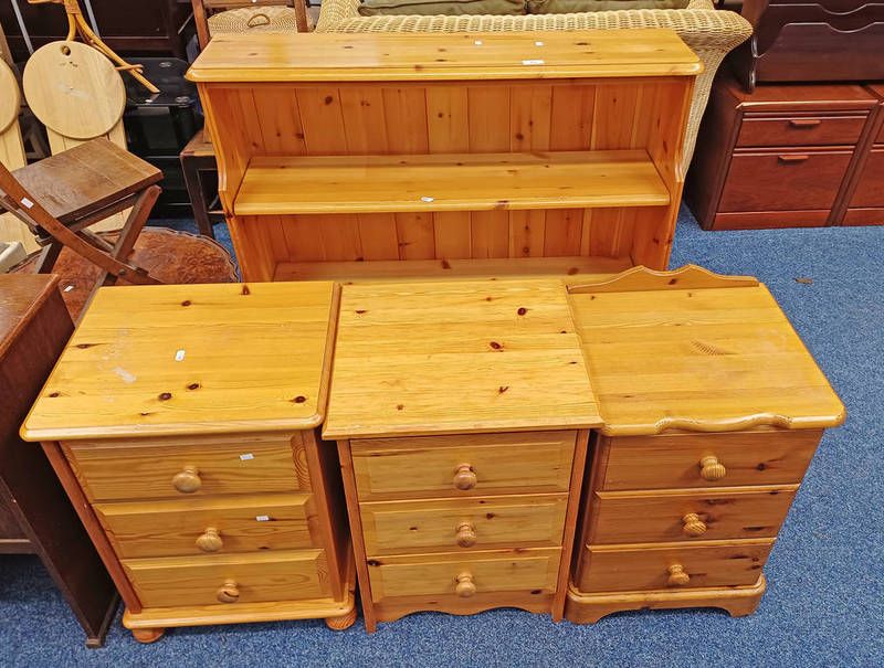 Pine open bookcase & 3 pine bedside chests