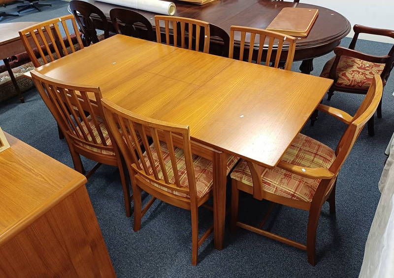 Mcintosh teak extending dining table with fold out centre leaf and set of 6 dining chairs including 2 armchairs - 168 cm long