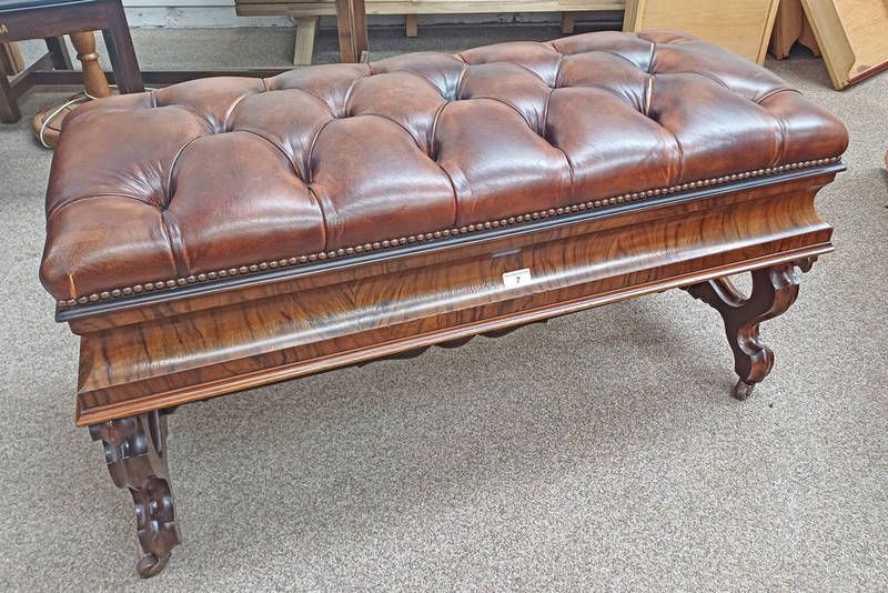 19th century walnut window stool with buttoned brown leather lift up seat of shaped ends
