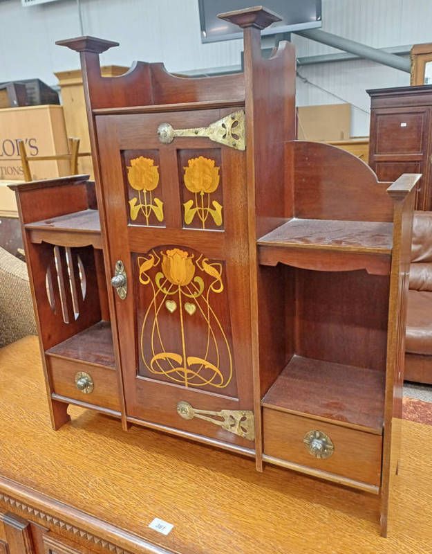 Mahogany wall cabinet with centrally set inlaid panel door with flower motif flanked by 2 drawers in the art nouveau style - 78 cm tall x 72 cm wide